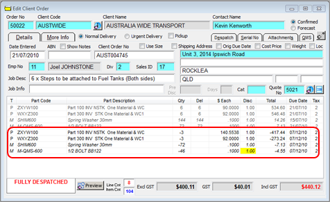 Open the Order Book module and click on the ‘Edit Client Order’ or ‘Edit Production Order’ icon. Enter the order number or press <F2> and select order number from pop-up list and click OK. Create new line items for the Part/s to be credited with minus quantities, press <F9> to save the Order. For the example, the order quantities have been halved with the other half being entered in minus quantities.