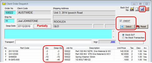 Still in the Order Book module, click on the ‘Despatch Client Order’ or ‘Despatch Production Order’ icon. Enter the Client/ Production Order number or press <F2> and select the required order from the pop-up list and click OK, press <TAB> to generate the window. Enter your employee number, and click on 'CREDIT' box to tick. Click on the Select button and click on items to be credited from the pop-up list (quantities will be minus figures) and click OK. Click on 'Stock Out' radio button if items are to be returned to stock or the 'No Stock Transaction' for no Inventory record, click on the Save icon.